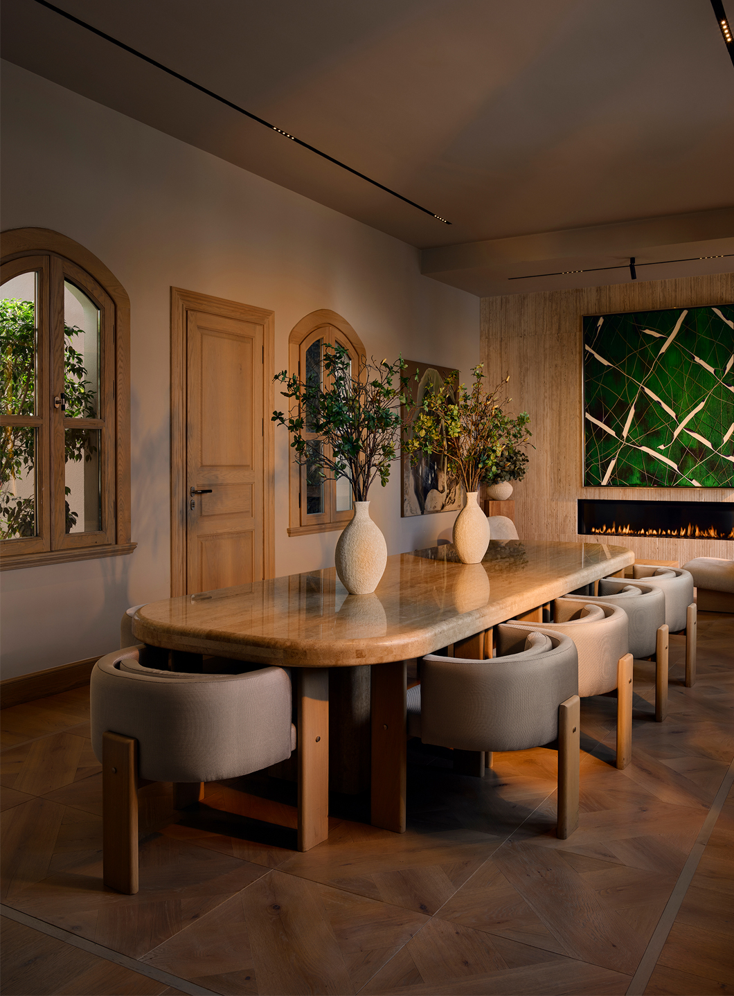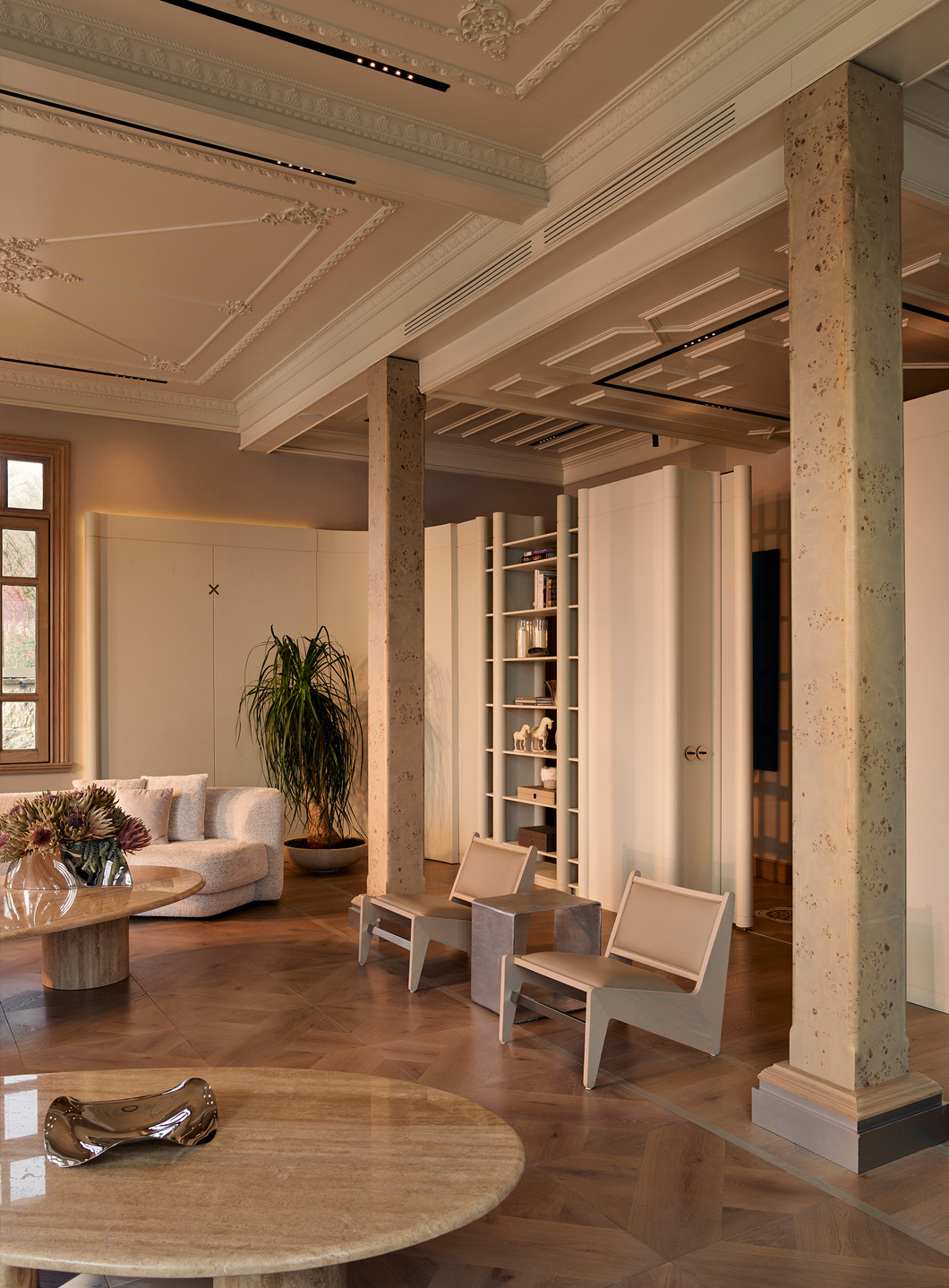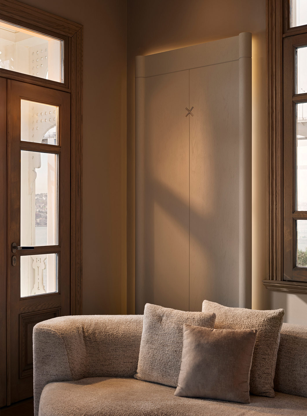 Escapefromsofa’s design at 181 House merges historical Ottoman-era elements with a modern aesthetic. The entrance hall opens into a grand living area defined by travertine stone columns, curved wall paneling, and a central niche window framing the Bosphorus view. Adjacent, the dining room with arched windows and a stone table continues the curved architecture, while an integrated stone fireplace creates a warm ambiance. A 300 m² terrace enhances indoor-outdoor flow, embracing the coastal scenery.