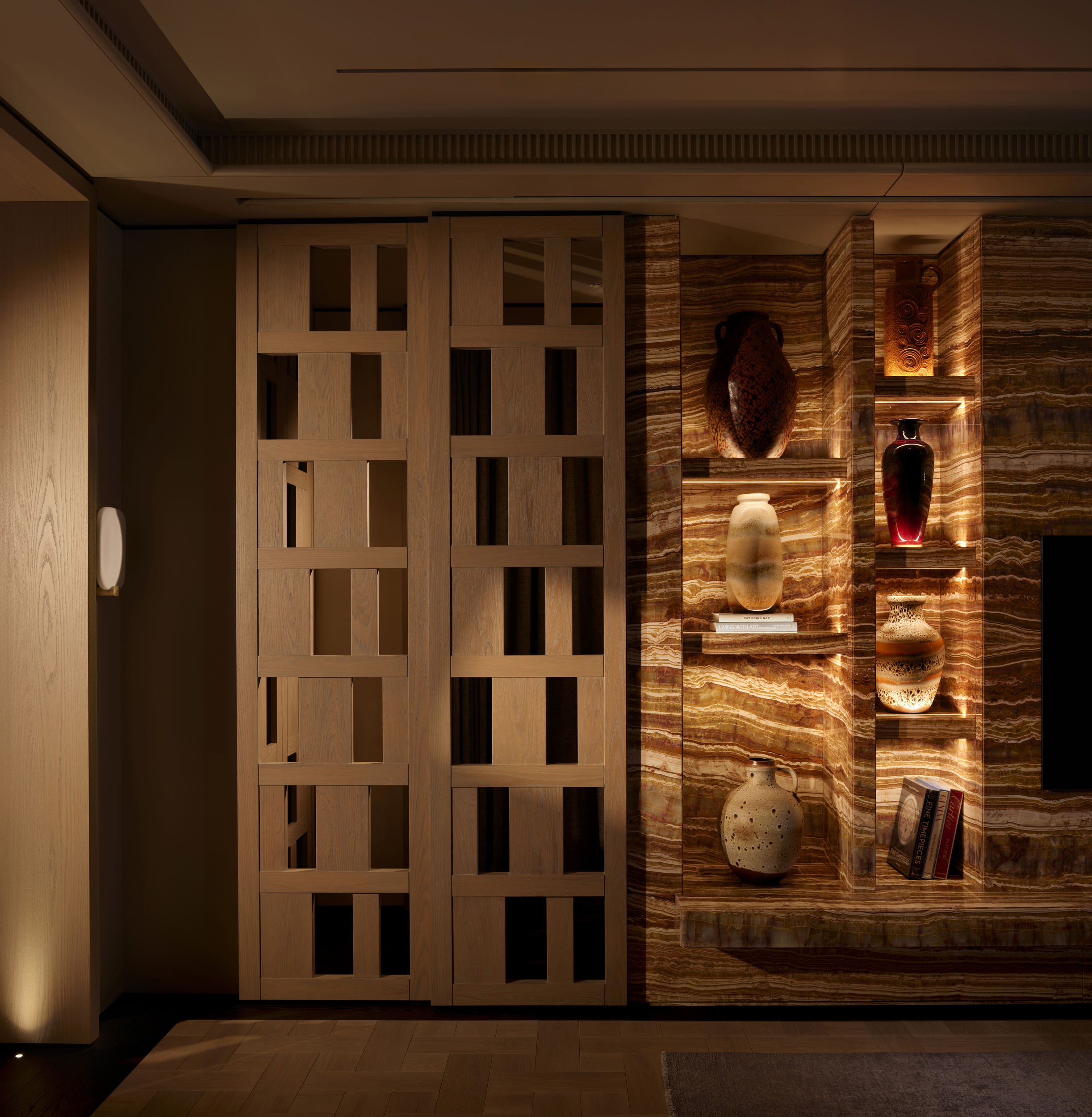 The design uses a layered palette of oak, lime plaster, and textured fabrics to create a tactile, timeless atmosphere. Large openings connect the interior to the private garden, letting daylight soften the spaces and frame the changing seasons. Custom modular seating, sculptural lighting, and travertine surfaces define the living area, turning daily rituals into quiet celebrations.