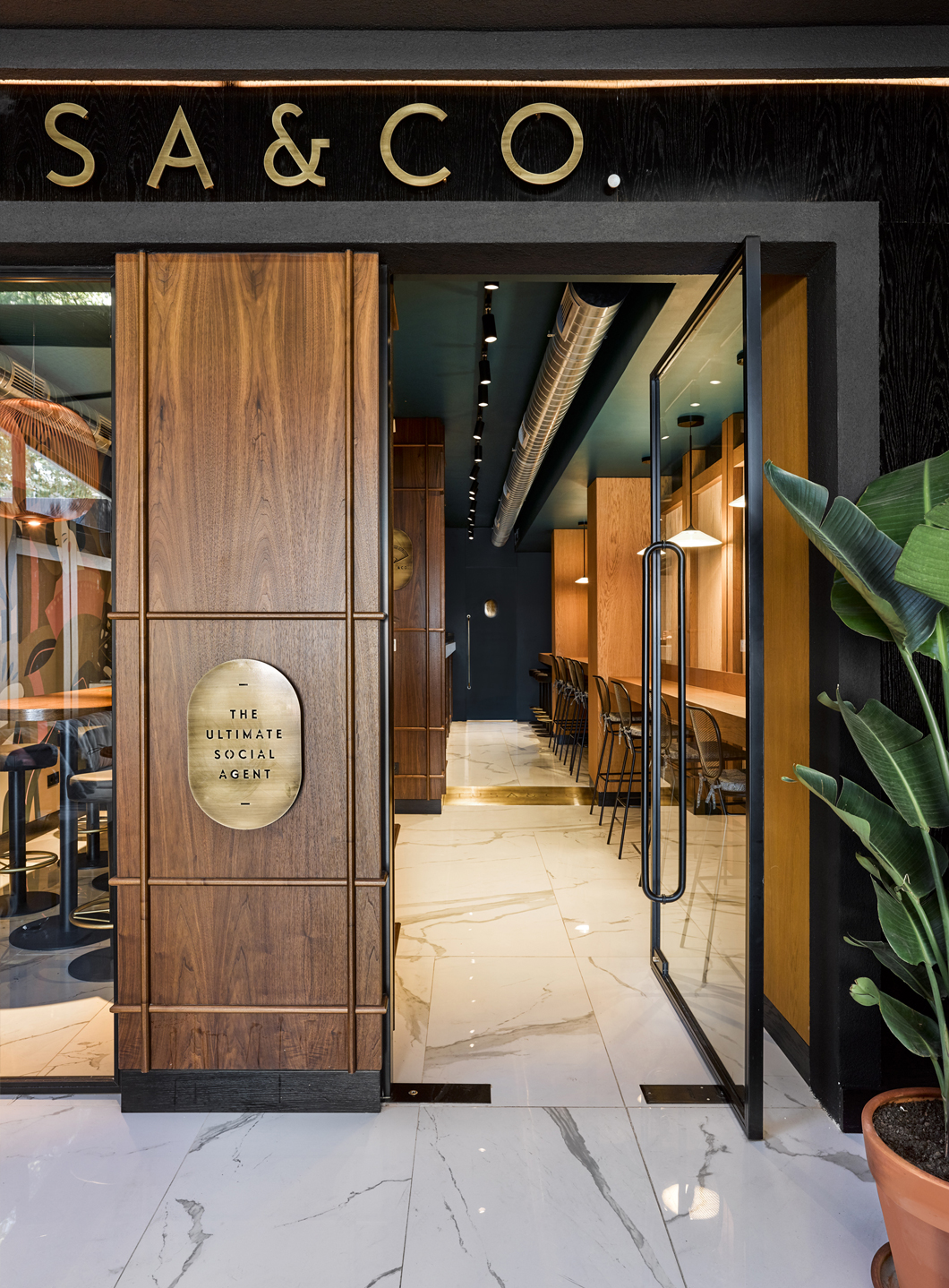 Escapefromsofa used a modern design approach with natural wood paneling on the walls, crafted with various techniques for added texture and warmth. Fine Carrara Neolith flooring, brass metal detailing, bold colors, and striking graphic elements contribute to the space’s lively and refined aesthetic. The interior accommodates 26 seats, while the 35 m² terrace offers additional seating for 28, maximizing the restaurant’s capacity.