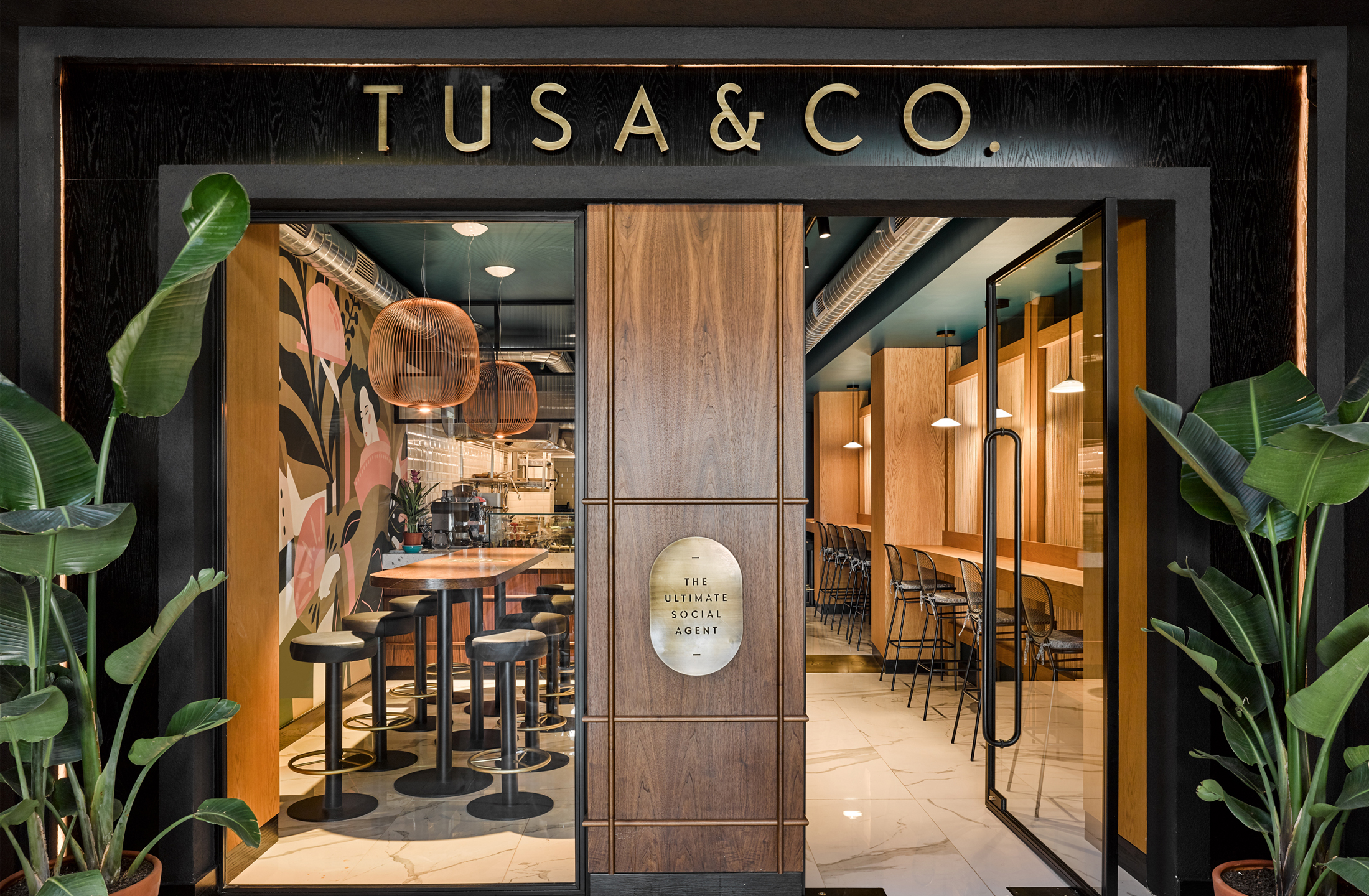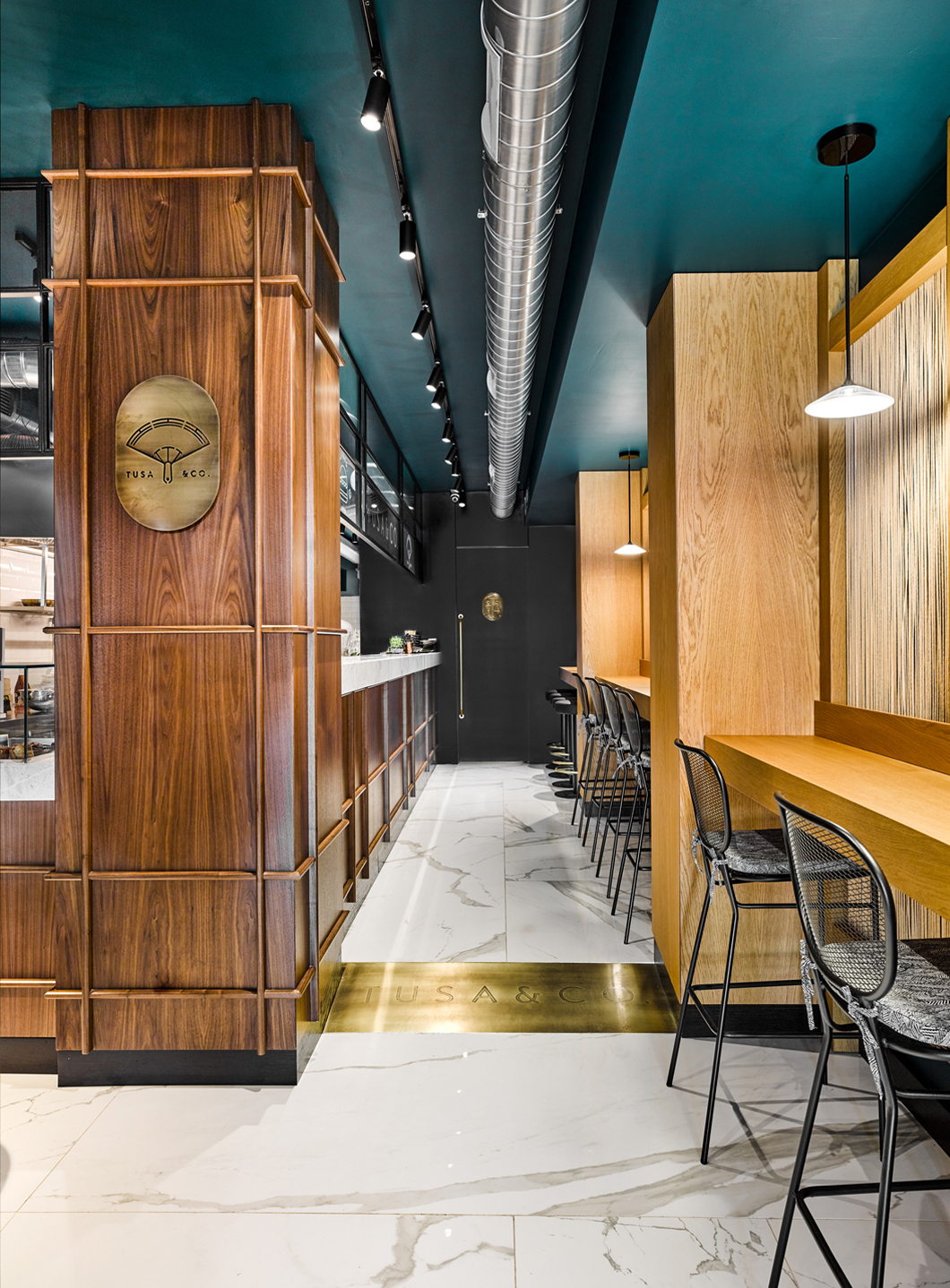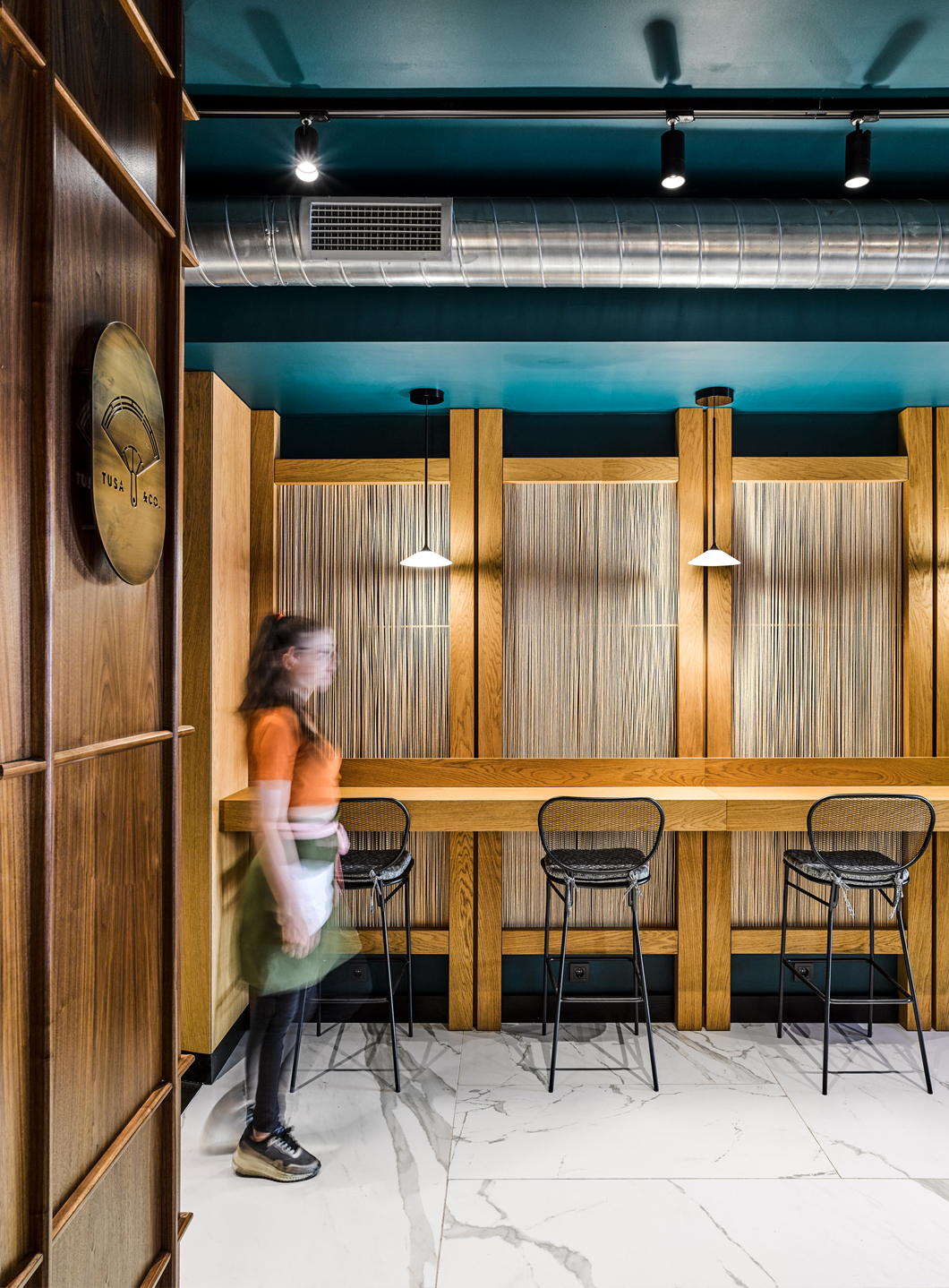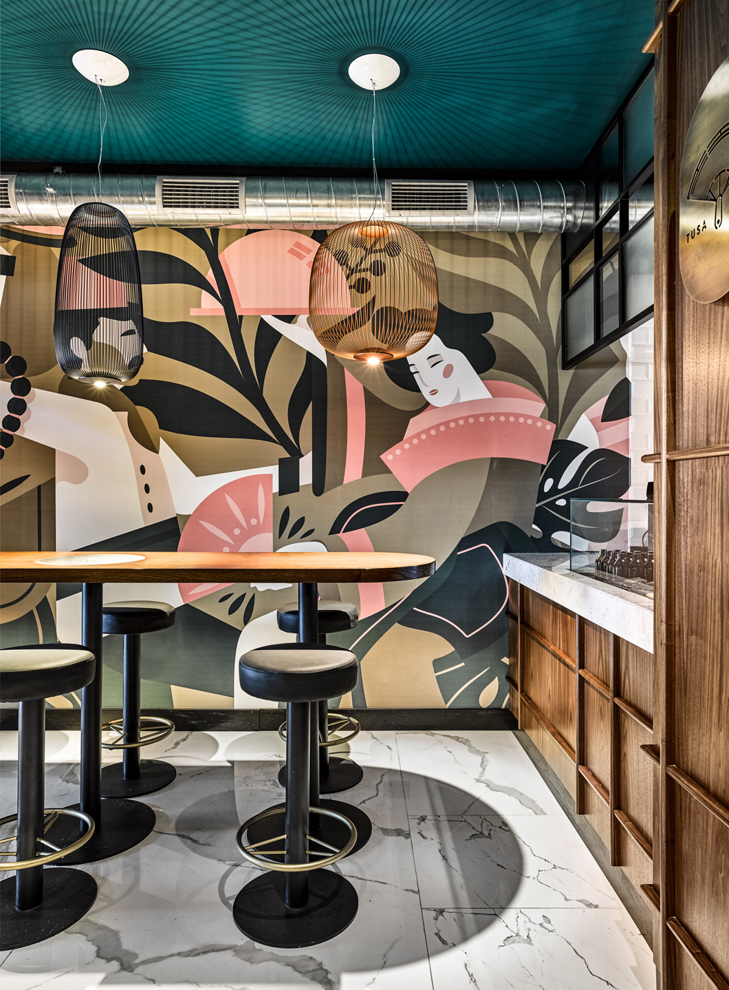 Custom furnishings designed by escapefromsofa are paired with iconic Foscarini pendant lamps, adding a touch of sophistication and completing the restaurant’s vibrant yet welcoming ambiance.